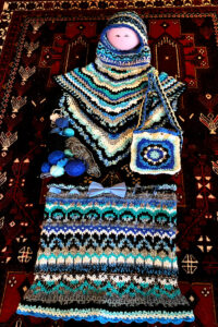 Farverige huer er skabt af restgarner og genbrugs-grydelapper/bordduge, som er nørklet af kvinder i fortiden. Genoplivede med Hønse-strikning/hækling.